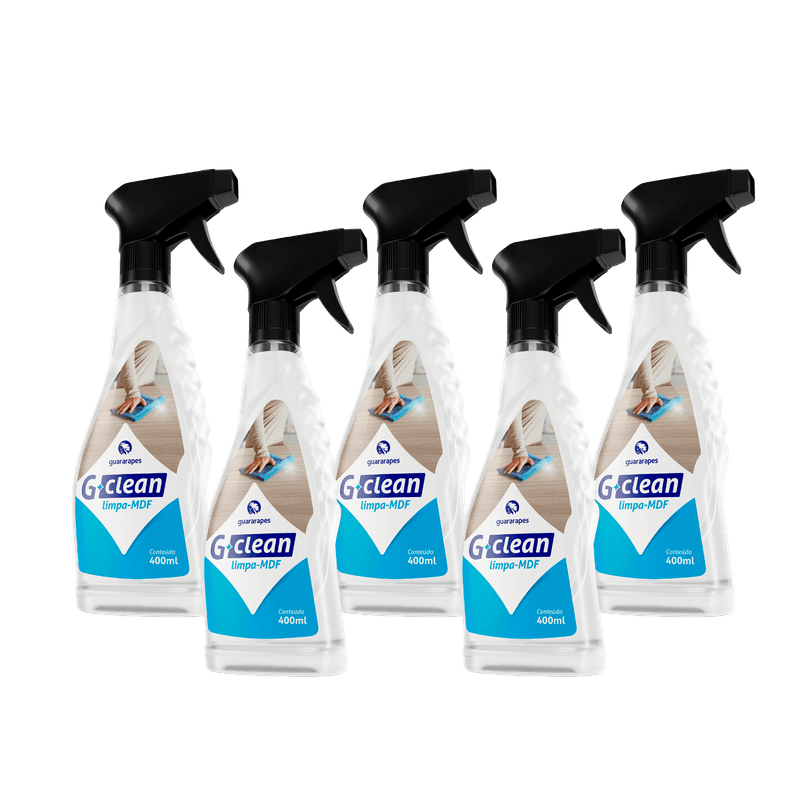 Kit com 5 G-Clean 500ml cada, nosso limpa-MDF com fórmula exclusiva desenvolvido pela Guararapes. Com uso indicado tanto para limpezas do dia-a-dia, quanto para uso em marcenarias.