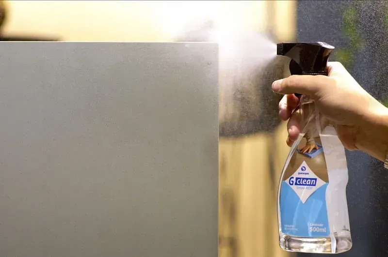 Basta borrifá-lo na superfície e passar um pano de algodão seco em movimentos retos sempre no mesmo sentido. Ele irá retirar a sujeira, gordura, colas, marcas de dedos, batom e canetas, sem agredir ou danificar o material e sem deixar aspecto engordurado.